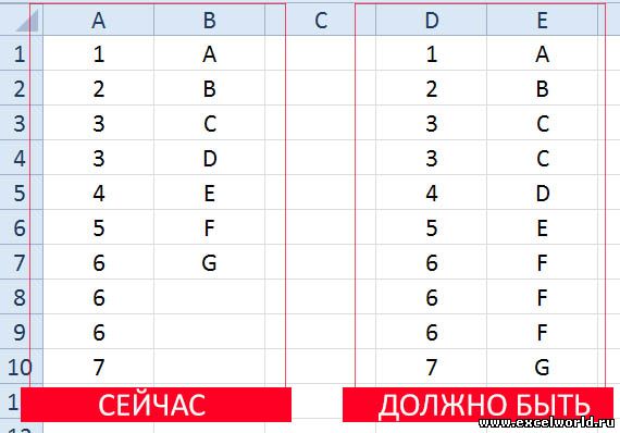 Есть 2 столбца. В первом столбце идут значения и некоторые из них в столбце дублируются. Справа другой столбец в котором значения не дублируются. На рисунке наглядно видно. Помогите пожалуйста создать макрос (ну или если есть другой вариант для решения такой проблемы), который бы смотрел значения в левом столбце начиная сверха и если последующее значение ячейки дублируется предыдущим, то в правом столбце напротив дубля производилось бы добавление ячейки со сдвигом ячеек в этом столбце вниз а в новосозданную ячейку дублировалось бы вышестоящее значение в этом (правом) столбце. Проще говоря чтобы создавалось соответствие дублей между столбцами.