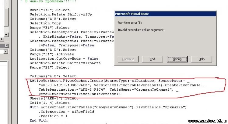 При формировании сводной таблицы макросом постоянно выдает ошибку.