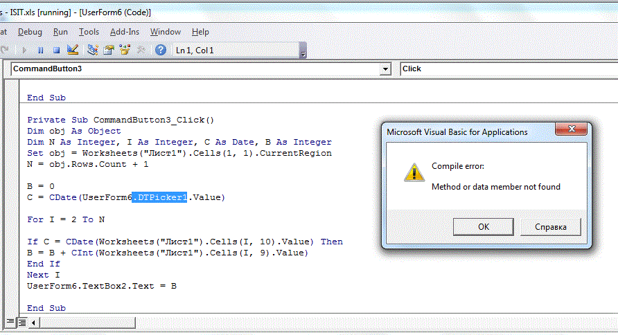 согласано вашему скриншоту на форме нет DTPicker1. возможны две причины: 1)на форме вообще нет DTPicker; 2 )у DTPicker другое имя ,не DTPicker1.Karataev