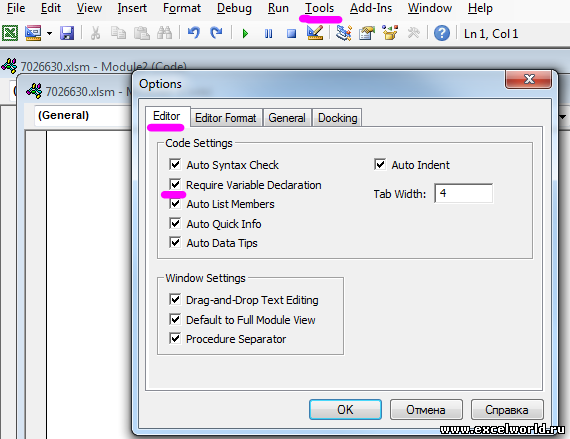 Чтобы избежать подобных неприятностей, можно использовать перед кодом (в первой строке модуля) волшебные слова Option Explicit. Они будут ставиться автоматически (в новый модуль), если Вы поставите галку в Туулс - Опшнс - Рекуире Вариабл Декларейшн