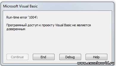 Так поставьте галку Доверять доступ к объектной модели проектов VBA в Центр управления безопасностью — Параметры центра управления безопасностью — Параметры макросов. Если мой склероз меня не подводит, это оно.StoTisteg