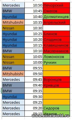 Есть 5 марок автомобилей, у каждой своя приоритетность: 1)Mercedes, 2)BMW, 3)Hyundai, 4)Mitshubishi, 5)Nissan (Наивысший приоритет Mercedes, самый низкий приоритет - Nissan). Есть 3 столбца(как в рисунке): 1 столбец - Марки автомобилей, 2 столбец - время, 3 столбец - Фамилия.Начнём с марки Mercedes, если обратить внимание на картинку за маркой Mercedes закреплены 4 фамилии (Иванов, Сидоров, Воронцов, Печорский) - из них Сидоров и Иванов закрепились в таблице согласно времени(самые ранние - 09:15, 09:20), а вот Воронцов и Печорский, пропустили Mercedes в 09:25, они закрепились в 09:45 и 10:50 соответственно ,так вот. раз они пропустили Mercedes в 09:25, в таблице они должны быть окрашены в красный цвет.