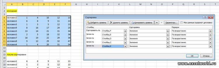 Отсортировав строки по данному столбцу идем в предыдущий столбец и делаем тоже самое, но смотрим теперь на значение столбца, которые сортировали до этого. И так до столбца 2 включительно, первый с текстом не сортируем. В таблице могут быть одинаковые строки полностью. Задвоение не убираем. если можно, то выделяем идентичные (по числам) строки цветом относительно остальных.