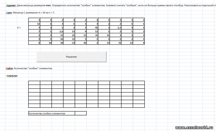 СообщениеДана матрица размером mxn. Определить количество "особых" элементов. Элемент считать "особым", если он больше суммы своего столбца. Реализовать в отдельной подпрограмме заливку строк диапазона содержащих "особый" элемент.