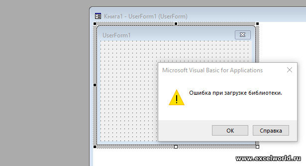 Сегодня в школе решил полностью защитить лист с алгоритмами для моего теста. В школе проблем не было, файл оставил там. Дома решил повторить произведенные в классе действия. Но происходит коллапс. При попытке в UserForm вставить кнопку или поле для ввода текста, вылазит "Ошибка при загрузке библиотеки". Файл из школы не переносил, а наоборот из дому в школу таскал. Дома Office 2016, в школе предполагаю 2013. И в школе все было нормально. Прихожу домой, открываю тот же файл, пытаюсь повторить все действия из класса, и ни работает... Потом решил создать новый файл, и в нем тоже такая же проблема. В Интернете нарыл только случай несоответствия библиотек при переносе файла, но и дома, и в школе лежат идентичные файлы (дома основной), перенос файла происходит только в школу.