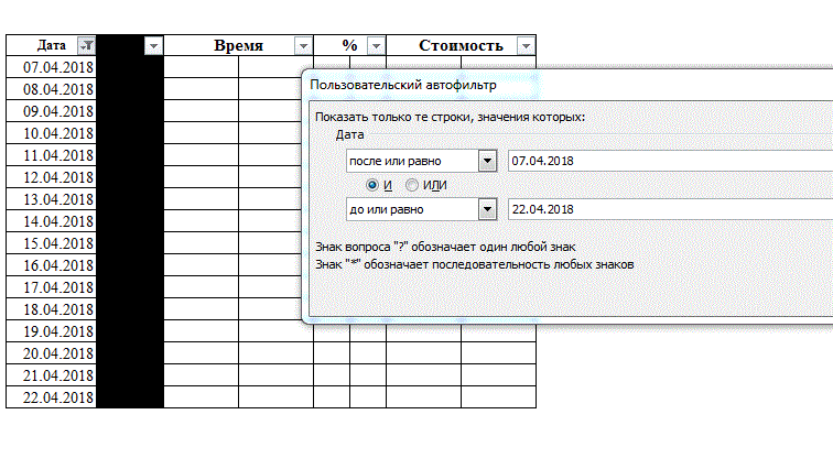 В строках N2 и Р2 я создал список дат. Допустим я там для примера выбираю (с 7.4.18 по 22.4.18) и рядом кнопка КОПИРОВАТЬ.
