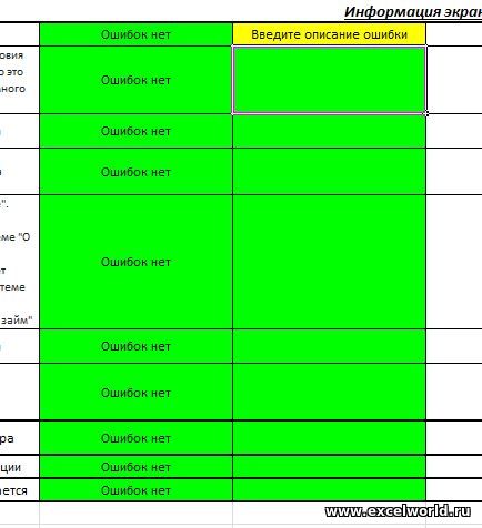 Else Sheets("МП").Select Range("D7").Select ActiveCell.FormulaR1C1 = "Введите описание ошибки" With Selection.Interior .Pattern = xlSolid .PatternColorIndex = xlAutomatic .Color = 65535 .TintAndShade = 0 .PatternTintAndShade = 0 End With End If