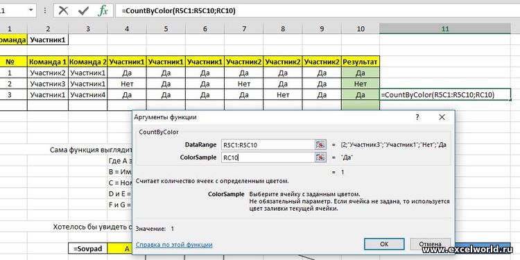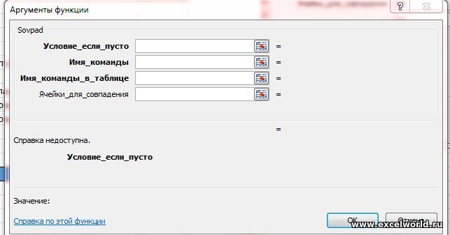 Сам я таким не пользуюсь, но интернет говорит, что можно только с использованием мастера функций. Немного переписал макрос - переназвал переменные. Теперь вводите в ячейку =Sovpad( и жмете кнопочку fx слева от строки формул Получаете такую форму для ввода (нижнее поле будет размножаться при заполнении) Для увеличения картинки тпните ее мышой