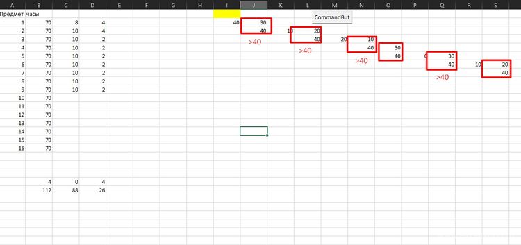 Всем привет! Файл во вложении распределяет часы в колонке B.Мы нажимаем кнопку , вводим кол-во часов, кол-во предметов , и часы итоговой аттестации и он нам выдает кол-во часов по предметам в колонке B. Помогите дополнить код, чтобы получился следующий алгоритм: Мы берем часы из колонки B и начиная с ячейки I1 распределяем эти часы по неделям по 40 часов. В нашем случае мы взяли две ячейки по 40 и у нас осталось 3 , т.к 83-80 = 3, и далее чтобы получить 40 мы к этим 3 должны прибавить 37. И далее опять берем вправо 40 и так пока все часы из колонки B не закончатся. Приложил пример как должно получатся. Надеюсь понятно объяснил) спасибо заранее! Oh_Nick
