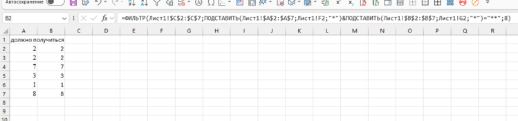 =ФИЛЬТР($C$2:$C$7;ПОДСТАВИТЬ($A$2:$A$7;F2;"*")&ПОДСТАВИТЬ($B$2:$B$7;G2;"*")="**";8)